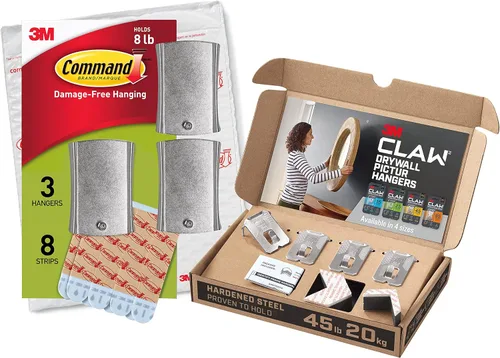 Contiene un paquete de colgadores de cuadros para paneles de yeso 3M CLAW con capacidad para 45 libras. & Command - Colgador universal para fotos, 3 ganchos 3M CLAW: resistencia de confianza probada para soportar hasta 45 libras. Incluye un marcador de puntos para marcar dónde se colgará el espejo o la pieza de arte antes de aplicar el colgador de cuadros de yeso 3M CLAW. 3M CLAW: No se requieren herramientas, simplemente empuja con los pulgares. Sin tachuelas: cuelgue en cualquier lugar de paneles de yeso. No te arrepientes: no quedan grandes agujeros en tus paredes. Command El colgador universal Jumbo incluye 3 ganchos y 8 tiras. Soporta hasta 8 libras. Command Colgador universal de cuadros jumbo: colgar sin daños.
