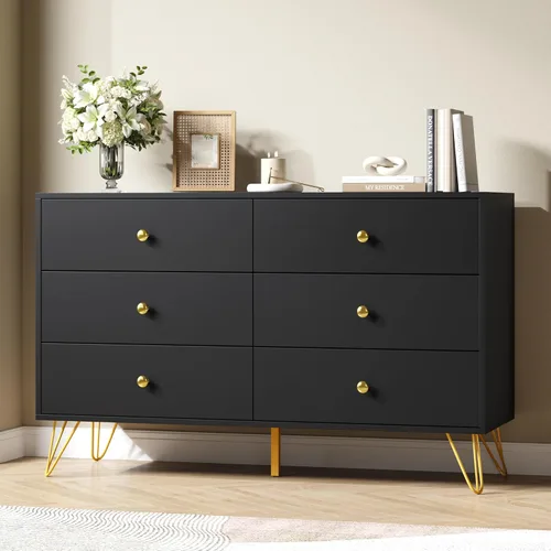 Gran almacenamiento de 6 cajones: tamaño total: 15.75 pulgadas de profundidad x 47.24 pulgadas de ancho x 25.93 pulgadas de alto. Este armario de almacenamiento grande de 6 cajones proporciona un amplio espacio de almacenamiento para organizar y almacenar tu ropa y la de tu familia, cosméticos, juguetes, libros u otros artículos personales. La parte superior de la cómoda de madera se puede decorar con plantas verdes, aromaterapia, televisores, lámparas de escritorio y otras decoraciones, haciendo que tu habitación sea más ordenada y hermosa, y decir adiós al desorden. Diseño llamativo: esta cómoda negra está equipada con un mango dorado, y el diseño general irradia una sensación de delicadeza y simplicidad. La superficie lisa sin rayas le da a esta cómoda una estética elegante y sofisticada. Ya sea solo o en combinación, esta cómoda moderna puede combinar fácilmente con cualquier estilo interior mientras que también es funcional Estable y resistente: cuatro patas de metal, diseño de pie cuadrado de soporte medio y dispositivo anti vuelco en la parte posterior proporcionan un soporte estable para esta cómoda, asegurando la estabilidad del producto. Es adecuado para familias con personas mayores, niños y mascotas. Esta cómoda de armario con un sistema deslizante confiable está hecha de MDF certificado de alta calidad, lo que aumenta la durabilidad del producto Cómoda multifuncional: esta cómoda multifuncional para dormitorio no solo se puede utilizar como un tocador en el dormitorio, un armario de juguetes en la habitación de los niños, sino también como un armario de almacenamiento en la sala de estar o un soporte de TV Montaje y servicio al cliente: la cómoda ancha viene con un manual detallado y una bolsa de tornillo. Si los accesorios existentes se dañan durante el transporte o la instalación, puede contactarnos para un reemplazo gratuito. Si encuentras alguna dificultad durante el proceso de instalación, RESOM tiene un equipo profesional de servicio al cliente que resolverá el problema en 24 horas