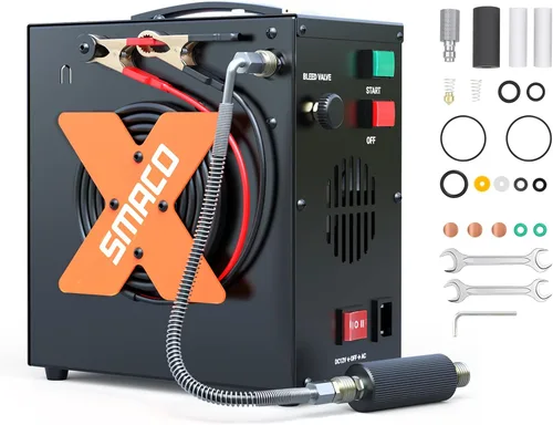 Sin aceite y sin agua. A diferencia de la mayoría de los compresores de aire en el mercado, hemos añadido ventiladores integrados de alta potencia en este compresor de aire PCP, que pueden mejorar la eficiencia de enfriamiento en gran medida y reducir el problema de conectar una bomba de agua adicional, hacer que tu inflado sea más fácil, limpio e higiénico Ajuste de presión y apagado automático. La presión máxima de trabajo de este compresor de aire es 4500Psi/30Mpa/300Bar. Hay dos punteros en el manómetro, uno para la presión en tiempo real, otro se utiliza para ajustar la presión. Solo necesita establecer una presión de inflado, y la máquina dejará de llenarse automáticamente cuando se alcance la presión de aire preestablecida, ya no necesita vigilar su tanque de paintball mientras está inflado. Nota: el ventilador de enfriamiento sigue funcionando mientras la presión alcanzó Velocidad de inflado rápida. Bajo voltaje de trabajo (12 V CC o 110/220 V AC), la velocidad del motor puede alcanzar hasta 2700 r/min, y la salida de aire es de 11 L/min. Nuestros resultados de prueba siguieron: para el envase de 0.5L de 0Psi a 3000Psi, pasó 11 minutos; para el envase de 1L de 0Psi a 3000Psi, pasó 26 minutos; para el envase de 2L de 0Psi a 3000Psi, pasó 46 minutos. Nota: el compresor de aire necesita 10-15 minutos para ser enfriado después de 25 minutos de trabajo Alimentado por coche y alimentado en casa. Este compresor de aire puede ser alimentado por la batería de automóvil de 12 V CC (necesita mantener tu máquina de automóvil en funcionamiento) o alimentado por 110 V-220 V en casa, tiene un dispositivo de conversión de voltaje de inversor incorporado, puedes ajustarlo fácilmente desde 110 V-220 V CA con la normalidad del usuario. Nota: el ajuste inicial es para 110 V CA en casa. El diámetro de la interfaz inflable es de 0.315 in, que es compatible con la mayoría de las pistolas de aire/paintball/tanque de buceo Ligero y portátil. Esta bomba de aire de alta presión solo pesa 21 libras, y el tamaño es: 9.6 x 5.6 x 10 pulgadas, es fácil de transportar