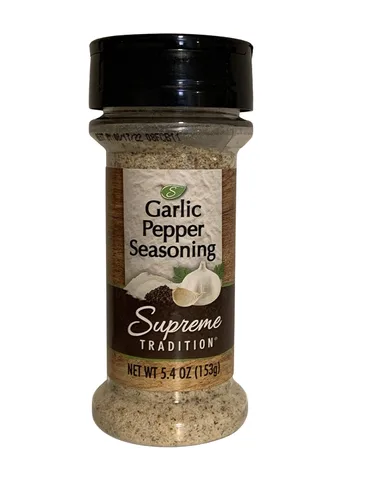 Ajo molido grueso y pimienta Delicioso en pollo, ternera, cerdo, ensaladas, verduras Una deliciosa adición a salsas, guisos y sopas y platos de pasta Espolvorea sobre papas fritas, puré de papas y palomitas de maíz Sin grasas saturadas o grasas trans