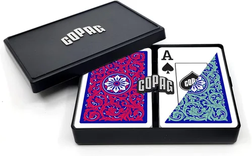 MATERIAL: Nuestras cartas son 100% de plástico PVC que se producen en nuestra instalación de última generación en Brasil. Proporcionan la durabilidad del plástico pero con la sensación auténtica de las cartas de papel. Al barajar y repartir estas cartas, te sorprenderá el acabado extraordinariamente suave. Son menos susceptibles a doblarse o dañarse por líquidos. Se pueden lavar y limpiar en comparación con las cartas de papel. Como resultado, una sola baraja de cartas Copag puede durar aproximadamente 50 veces más que una baraja de papel. TIPO DE CARTA: Este producto incluye mazos de 52 cartas, 2 comodines y una tarjeta de garantía. Las barajas son del tamaño de bridge, que miden 3 1/2 " por 2 1/4 ". Esto se considera un tamaño "estrecho". El tamaño de la letra es de índice jumbo, que es más grande en comparación con nuestras tarjetas de índice normales. Cada letra y símbolo miden aproximadamente 1/2 pulgada de longitud. EMPAQUE: Las barajas vienen incluidas en un estuche duro de plástico resistente con un divisor con el símbolo de Copag. La funda tiene un diseño delgado que solo mide 1 pulgada cuando está cerrada. La funda hará que las cartas sean más fáciles de almacenar y transportar a tus noches de juego HISTORIA: Copag ha sido líder en el mercado de cartas de juego durante más de 100 años. Nuestra herencia se originó en Brasil y se extendió por América del Sur. Copag fue introducido más recientemente en los Estados Unidos a principios de la década de 2000. Nuestro diseño neotérico se introdujo en 2021 y cuenta con un tema y colores modernos de marca