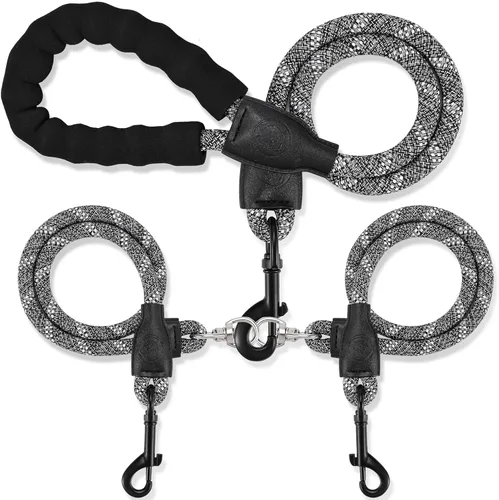 2 correas para perro: correa principal de 31 pulgadas + correa auxiliar doble (cada una larga de 28 pulgadas) Diseño de material duradero: el hardware es todo de metal, mientras que la cuerda de escalada está hecha de nailon duradero. Correa para perro Mengbei tribe más duradera pero ligera, fácil de limpiar. Cada cinturón de tracción individual es duradero, sólido pero absorbe los golpes Diseño sin enredos: el acoplador giratorio de 360° y el divisor es perfecto para evitar enredos, y los dos cierres giratorios de aleación están unidos en cada una de las correas elásticas, permite el ajuste automático cuando la correa doble para perro se cruza, sin limitaciones para tus perros mientras se mueven de lado a lado sin ensuciar la correa Diseño de mango de esponja: nuestra correa para perro viene con un mango acolchado suave, agarre cómodo nunca dañará tu brazo y protege tu mano de quemaduras de cuerda. Libera una de tus manos y controla ambos perros con una correa, la vida es fácil Diseño de rayas reflectantes: beneficia la seguridad adicional por la noche de las costuras reflectantes en todas las correas del perro, garantiza la seguridad de ti y de tus perros al caminar por la noche en un entorno mal iluminado
