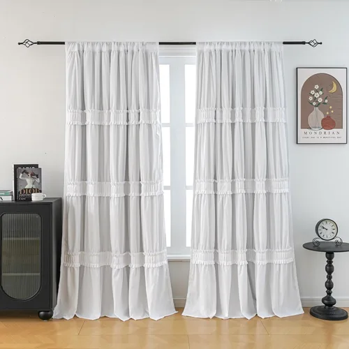 Material preferido: las cortinas boho chic están hechas de microfibra cepillada de alta calidad, con un 85% de forro opaco. Es suave y cómodo, mientras que el forro blanco de alta tecnología ayuda a bloquear el sol. Presentan un aspecto romántico de cabaña, protegen tus muebles de la decoloración del color y te brindan una buena noche de sueño durante el día. Exquisita artesanía que hace que su habitación sea diferente: junto con el fruncido único, hay 3 filas de detalles de volantes hechos a mano que crean una visión dulce y elegante para su habitación. Combinadas con la elegancia de los volantes y el lujo de la pajarita, estas cortinas de bloqueo de luz dan un toque final de clase y sofisticación para iluminar instantáneamente tu espacio. Cortinas versátiles para ti: estas cortinas opacas de 2 capas proporcionan un atractivo funcional y decorativo. No solo pueden hacer que tu habitación se vea elegante, sino que también hacen un gran trabajo de bloqueo de luz, aislamiento térmico, reducción de ruido, ahorro de energía y protección de la privacidad. Lo que puede obtener y fácil de lavar: un conjunto de 2 paneles, cada panel mide: 52 pulgadas de ancho x 84 pulgadas de largo y tiene un bolsillo para barra de 3 pulgadas para una fácil instalación y deslizamiento. Lavable a máquina y lavar por debajo de 86°F en ciclo suave. Detergente suave sin blanqueador. Secar en secadora y planchar a baja temperatura en la cara según sea necesario. No mezclar lavar con cosas duras en caso de rayar las cortinas.