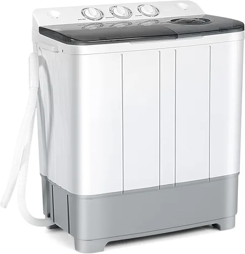Con tina doble y gran capacidad: Con el diseño de doble función de tinas gemelas, esta lavadora te permite lavar y centrifugar la ropa al mismo tiempo. Y tiene una capacidad de lavado de 13.2 libras y una capacidad de centrifugado de 8.8 libras, lo que maximiza la satisfacción de los requisitos de lavandería de la familia. Control de temporizador y fácil operación: nuestra lavadora multifuncional utiliza un control de temporizador separado para facilitar las operaciones de lavado y centrifugado. Y el temporizador de la lavadora funciona hasta 15 minutos mientras que el temporizador de giro funciona hasta 5 minutos. Además, hay modo suave, modo estándar y modo de drenaje para que elijas de acuerdo con diferentes materiales de ropa. 【Motor potente y de bajo ruido:】El motor de alto rendimiento asegura un funcionamiento suave, salida continua y alta seguridad para una vida útil duradera. Puede ayudarlo a ahorrar energía y completar las tareas de lavandería de manera efectiva. Además, no hará ruidos molestos ni molestará a los vecinos durante su funcionamiento. Puedes ver el proceso de lavado/centrifugado en cualquier momento a través de la cubierta transparente. Diseño compacto para varias escenas: mide 25 x 14.5 x 27.5 pulgadas, esta mini lavadora se puede colocar en dormitorios, apartamentos, casas rodantes, camping u otros lugares limitados. Es fácil de mover y transportar a cualquier lugar debido a su estructura ligera. Además, la resistente carcasa de PP te permite usarla durante mucho tiempo sin que se rompa. Fácil de drenar y usar: la excelente bomba de drenaje y la manguera de drenaje de 54 pulgadas aportan mucha comodidad para drenar el exceso de agua sucia. Y el dispositivo de filtro evita que la salida del desagüe se bloquee por desechos innecesarios. Solo coloca la ropa, añade detergente para la ropa, llénala con agua, ajusta el temporizador y puedes empezar a lavar tu ropa.