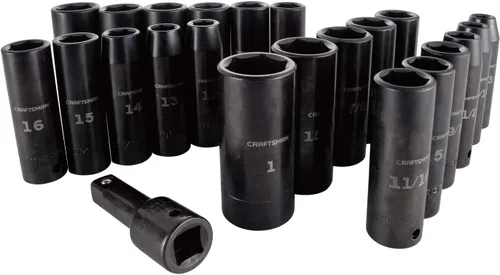 | Elementos incluidos | (11) 1/2" Dr Shallow Impact Sockets SAE (3/8", 7/16", 1/2", 9/16", 5/8", 11/16", 3/4", 13/16", 7/8", 15/16", 1 IN), (11) 1/2" Dr Shallow Impact Sockets MM (12, 13, 14, 48 ES/42 ES , 17, 18, 19, 21, 22, 0.945 in), (1) 1/2" Dr Impact Ext Bar - 3 |
