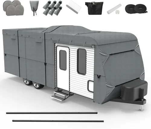 Para remolque de viaje de 22 a 24 pies de largo (tamaño: 292 pulgadas de largo x 102 pulgadas de ancho x 104 pulgadas de alto). Incluye 4 fundas para neumáticos, 1 parche de reparación adhesivo, 1 bolsa de almacenamiento; 1 tapa de escalera; 2 correas resistentes al viento; 2 postes de acero de asistencia Fácil de instalar: viene con poste de acero que puede ayudar a instalar la cubierta de RV de forma segura sin subir al techo. También los postes de acero pueden establecer toldos laterales para cubiertas de vehículos recreativos La parte superior gruesa de 6 capas y los lados de una sola capa protegen contra la lluvia, la nieve y los arañazos para protección contra todo tipo de clima. Resistente al viento: proporciona 2 correas adicionales para atar el cuerpo de tu caravana para una mejor protección en el viento fuerte y hebillas en la parte inferior, esquinas de dobladillo elásticas, paneles de tensión delanteros y traseros ajustables que proporcionan un ajuste personalizado, protege tu cubierta de RV de soplar con viento fuerte