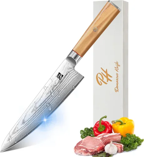 1. Cuchillo de chef japonés de damasco de 67 capas de alta calidad: forjado de acero Damasco de 67 capas de alta calidad con un núcleo de alto carbono 10Cr15MoV, este cuchillo de chef de grado profesional se somete a un tratamiento térmico al vacío para lograr una dureza de 60-62 HRC. Ofrece una resistencia superior a la corrosión y una retención excepcional de los bordes, minimizando las necesidades de afilado para una precisión duradera en cada corte. 2. Borde de corte japonés de 15° afilado a mano: meticulosamente afilado por maestros artesanos (más de 10 años de experiencia), este cuchillo de chef de Damasco cuenta con un borde afilado de 15° para una nitidez y durabilidad sin igual. El triple pulido CNC + chorro de arena garantizan un acabado impecable y de baja fricción para cortar carnes, verduras y mucho más. 3. Mango ergonómico de madera de olivo para un máximo control: diseñado para mayor comodidad y estabilidad, el mango hexagonal de madera de olivo del cuchillo de chef se seca con precisión al 7% de humedad y se pule para un agarre sin costuras y resistente a las grietas. El refuerzo de acero inoxidable refuerza el equilibrio, mientras que el grano de madera natural añade elegancia, ideal para largas sesiones de cocción. 4. Instrucciones de cuidado profesional para mayor durabilidad: lavar a mano (evitar lavavajillas) y secar inmediatamente. Úselo con tablas de cortar de madera/bambú; nunca corte huesos o alimentos congelados. Incluye un paño de mantenimiento para la protección de la hoja. 5. Garantía de calidad de por vida: cada cuchillo japonés de Damasco es rigurosamente inspeccionado antes del envío. Respaldado por un servicio de atención al cliente receptivo: contáctenos para cualquier problema. Un regalo perfecto para chefs, cocineros caseros y entusiastas de la gastronomía.