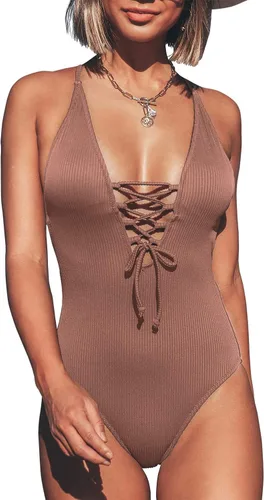 CUPSHE Traje de baño de una pieza con cordones, cuello en V y color liso para mujer