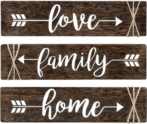 Hermosa decoración para el hogar: estas decoraciones de arte de pared proporcionan el calor, aliento, unión, felicidad, que es nuestro hogar familia amor signos de representación. Y como una hermosa adición a su espacio vital y espacio de trabajo. Alta calidad: estos carteles de decoración de granja están hechos de madera de paulownia premium, cuerda de cáñamo decorada, el letrero de palabras nunca se cae pintura, que es mejor que la pintura en aerosol ordinaria. Creando el look vintage. Añade un toque único a tu casa. Estilo de granja: Ven con amor, hogar, letreros familiares, se pueden colgar juntos o separados, crea un ambiente cálido. Ideal para colgar en el dormitorio, guardería, baño, cocina, sala de estar o decoración de pared de oficina. O como guía de fiesta en tu pared exterior. Diseño elegante: el diseño rústico de madera colgante con palabras y flechas de pintura, se ve rústico y llamativo, lo que te dará una sensación visual cómoda cuando los cuelgues en la pared o en un estante. Paquete y tamaño: 3 piezas por juego. Cada cartel: 13 "largo x 3 "ancho, y 0.6" de grosor. Ligero para colgar en cualquier pared. Regalo perfecto para tu familia y amigos, y como un regalo ideal en el día de la madre, cumpleaños, Navidad, Acción de Gracias.
