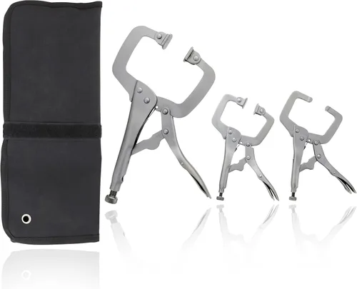 Bloquea y sujeta tu proyecto: utiliza el DCT | Juego de abrazaderas C de herramientas manuales de 3 piezas para agarrar tu proyecto sin deslizamiento; este juego de abrazaderas C de bloqueo incluye 1 abrazadera con almohadillas regulares y 2 abrazaderas con almohadillas giratorias para trabajos automotrices sin daños con paneles de carrocería de automóviles, la mayoría de mejoras y reparaciones del hogar, proyectos de juntas de madera para carpintería y algunas aplicaciones de soldadura 3 abrazaderas, 2 tamaños: abrazadera de 11 pulgadas con puntas de almohadilla giratoria para asegurar trabajos medianos a grandes, apertura máxima aproximada de 1.0 in, apertura máxima de 0,9 pulgadas x 1,1 pulgadas (0.9 in x 1.1 in), abrazadera de 6 pulgadas con puntas de almohadilla giratoria para piezas pequeñas a medianas, apertura máxima aproximada de 0,7 pulgadas (0.7 in) 0.7 pulgadas. x 0.8 pulgadas (0.7 in x 0.8 in) tamaño de la cara de la abrazadera plana; abrazadera de 6 pulgadas con puntas regulares, apertura máxima aproximada de 1.3 pulgadas (1.3 in), tamaño de cara de abrazadera redondeada de 0.4 pulgadas x 0.3 pulgadas (0.4 in x 0.3 in) Construido para durar: construido de acero al carbono niquelado para una máxima resistencia y longevidad; tornillo de ajuste de llave hexagonal para ajustar a la presión correcta; liberación de gatillo con protección clásica para máxima fuerza de bloqueo y mantiene los alicates bloqueados de forma segura; a diferencia de otras abrazaderas tipo C, estos alicates de bloqueo de abrazadera C están diseñados con el mango opuesto a la abrazadera para permitir el acceso a espacios reducidos; cada abrazadera de trabajo de madera viene ligeramente engrasada para resistencia al óxido (recomendamos lubricar entre usos) Fácil almacenamiento: bolsa de herramientas enrollable de lona de 15 pulgadas x 13.75 pulgadas (15.0 in x 13.7 in) que incluye 2 ojales de metal para colgar en tu tablero o pared; incluye 3 bolsillos individuales; rollos de hasta aproximadamente 13.75 x 5.75 x 2 pulgadas (13.7 in x 5.7 in x 2.0 in) y sec. ures cerrados con un adjunto Cierre de velcro para un fácil transporte, almacenamiento seguro y organización rápida Contenido del paquete: el paquete de abrazaderas de soldadura y carpintería incluye (1) abrazadera de 11 pulgadas con puntas giratorias, (1) abrazadera de 6 pulgadas con puntas giratorias, (1) abrazadera de 6 pulgadas con puntas regulares y (1) bolsa de almacenamiento enrollable para tu comodidad