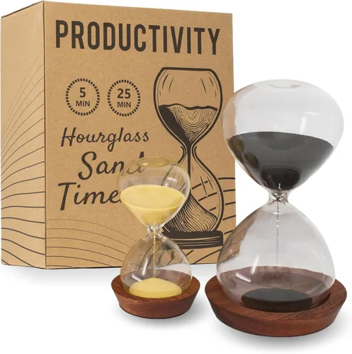 • 📈 Take Your Productivity to the Next Level: Implementing the highly popular and effective technique using these hourglass sand timers will have you crushing your goals the minute you flip the first timer. These timers are easy to use and you can start right away! 💪 Improve Your Time Management Skills: Use the black sand timer for 25 minutes of uninterrupted focus, then use the gold sand timer for 5 minutes of relaxation. Repeating this process throughout your task at hand trains your brain to work more efficiently and recharge during breaks. 🎁 Simple and Timeless Design: These durable hourglass sand timers are designed with minimalism and purpose in mind. They have their own wooden stands with felt bases for added stability. The timers come well-packaged in an attractive box, making it a great gift all around. 🛠 Tools with Versatility: These sand timers can be used separately or together, creating endless possibilities for not only increasing productivity but also cultivating mindfulness. Use them in the kitchen while cooking, in the classroom for studying, in the gym for a workout, and other things like self-care and meditation. ✨ Unique Vintage Style: Combine beauty and purpose with this striking pair of black and gold hourglass sand timers. The natural elements of glass, sand and wood make for an eye-catching and elegant decorative item as well as an interesting conversation starter.