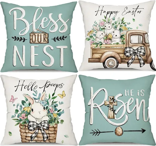 DFXSZ Fundas de almohada de Pascua de 18 x 18 pulgadas, juego de 4 fundas de almohada de poliéster con diseño de hojas de eucalipto de conejo,