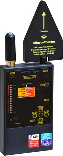Grado profesional: La herramienta ideal para buscar transmisores digitales y analógicos en un amplio rango de frecuencias. Antena principal (ANT1): 50 MHz – 12,000 MHz Antena auxiliar (ANT2): 2.4 – 2.48 GHz y 4.9 – 5.875 GHz La mayor sensibilidad a las señales Bluetooth y Wi-Fi permite la detección de fuentes inalámbricas desde 50 cm hasta 2 m. Detección completa de señales: detecta activamente señales GSM, Bluetooth, WiFi y RF mediante un indicador gráfico de barras de 16 segmentos que ofrece un amplio rango dinámico. Admite cuatro modos operativos: silencioso, sonido, vibración y mixto. Función de correlación avanzada: Identifica transmisores FM a través de un mecanismo de sonido de sondeo. Cuando un transmisor capta la señal de sondeo, la pantalla de demodulación se sincroniza con el sonido, alertándote de su presencia. Precisión y durabilidad: cuenta con dos niveles de sensibilidad (a través de un atenuador), un cuerpo metálico duradero y control por microprocesador. La antena auxiliar adicional ayuda a reducir la interferencia de fuentes externas, asegurando una detección confiable en entornos urbanos. Funciona hasta 20 horas con 2 pilas AAA. Empodera tu seguridad: équipate con una herramienta de contravigilancia de vanguardia en la que confían los profesionales. Con el Protect 1206i, invierte en tranquilidad y toma el control proactivo de tu privacidad.