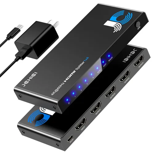 🎮【4K@60Hz Ultra HD y soporte HDR】 Compatible con los estándares HDMI 2.0, este divisor ofrece una impresionante resolución 4K a 60Hz con compatibilidad HDR. Disfruta de películas y juegos con imágenes nítidas y realistas. 📺【Divisor HDMI 1 Entrada 4 Salidas】 Distribuye fácilmente una señal de entrada HDMI a cuatro dispositivos de salida HDMI simultáneamente. Perfecto para conectar televisores, proyectores y múltiples pantallas en cines en casa, salas de conferencias o configuraciones de oficina. 🖥️【3 modos EDID para compatibilidad flexible】 Cuenta con modos AUTO/COPY/SCALER para optimizar automáticamente la configuración de salida para pantallas conectadas. Mantiene una salida de video estable incluso cuando se mezclan monitores con diferentes resoluciones. ⚡【Verdadero funcionamiento Plug-and-Play】 No requiere controladores ni software, funciona al instante con la mayoría de los dispositivos convencionales. Las patas de goma antideslizantes garantizan una colocación estable. 🔊【Transmisión de audio de alta fidelidad】 Compatible con formatos de audio premium, incluyendo DTS-HD, Dolby TrueHD, LPCM7.1, DTS, Dolby-AC3 y DSD. Ofrece audio sin pérdidas a través de HDMI sin degradación o retraso de calidad. 📦【Contenido del paquete】 ①Divisor HDMI × 1 ②Cable de alimentación USB × 1 ③Adaptador de corriente × 1 ④Manual de usuario × 1 ⑤Almohadillas de goma antideslizante × 4 Soporte posventa confiable: respaldado por nuestro equipo técnico dedicado, incluyendo 2 años de garantía y soporte al cliente de por vida para una propiedad sin preocupaciones.