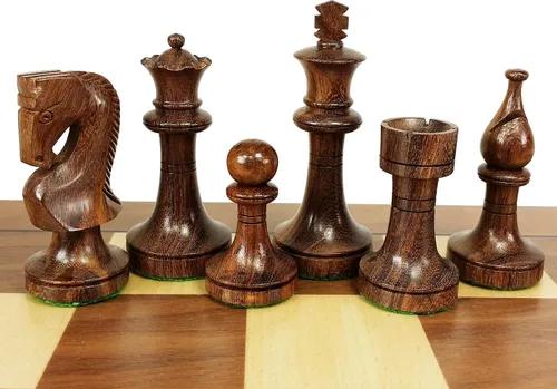 Juego estándar de 32 piezas de ajedrez estilo staunton en un diseño de caballero ruso SIN TABLERO. Los hombres de ajedrez son acacia sólida y boj, de peso único y fieltro. Dimensiones de la pieza: King: 3 1/2" alto Con 1 7/16" base, Queen: 3 " con 1 7/16" base, Obispo: 2 3/4" con 1 1/4" base, Caballero: 2 1/2" con 1 1/4" base, Torre: 2 1/8" con 1 1/4" base, peón: 1 7/4" 8.0 in de alto Base de 1/8 pulgadas. Peso total de la pieza: 1 libra 11 oz.