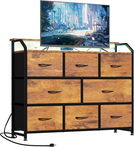 【Comando Smart Vibe】Transforma cualquier habitación con luces LED inteligentes controladas por aplicación integradas en tu tocador DUMOS Sincroniza colores dinámicos con tu música, explora innumerables modos preestablecidos y establece la escena perfecta, ya sea una fiesta animada, una acogedora noche de cine o una noche tranquila, todo sin esfuerzo desde tu teléfono inteligente. 【Estación de energía integrada】Mantén tu mesita de noche y zona de entretenimiento sin desorden. Esta cómoda DUMOS cuenta con una estación de alimentación certificada UL/ETL con 2 salidas de CA, 1 puerto USB y 1 puerto tipo C, que ofrece una carga rápida, segura y centralizada para todos tus dispositivos. Organización y pantalla versátiles: la parte superior de madera resistente soporta hasta 66 libras y se adapta a televisores de hasta 45 pulgadas, con iluminación LED integrada que acentúa maravillosamente tu decoración. Ocho cajones profundos de tela con inserciones reforzadas de MDF proporcionan un almacenamiento generoso y organizado para ropa, libros, aperitivos o artículos esenciales de medios. Durabilidad y estabilidad mejoradas: diseñada para durar, esta cómoda de almacenamiento cuenta con un marco de metal resistente y cajones de tela plegables reforzados con tableros de MDF para resistir la flacidez y el desgaste. Los soportes antiinclinación y los pies de nivelación ajustables ofrecen una estabilidad inquebrantable en cualquier superficie del piso, diseñados pensando en la seguridad de tu familia. Configuración y soporte sin esfuerzo: disfruta de una experiencia de montaje suave y sin estrés con nuestro claro manual paso a paso y video tutorial guiado. ¿Necesitas una mano? Nuestro dedicado equipo de servicio al cliente siempre está listo para ayudar, por lo que puede configurarse con confianza y comenzar a disfrutar de su cómoda de inmediato.