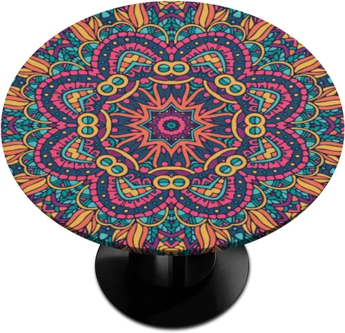 Elegante mantel redondo de mandala para mesa circular, color naranja y rojo, mantel redondo de poliéster ajustable con elástico para cocina,