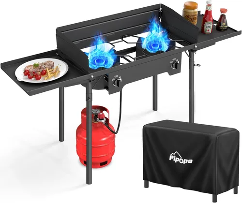 【Todos los accesorios que necesitas】Esta estufa de propano incluye todo lo que necesitas para empezar: estantes laterales plegables de dos lados, una pantalla cortavientos de tres lados, una cubierta impermeable Oxford 600D, asas plegables dobles y un regulador de 20 PSI certificado por CSA (tanque de propano no incluido) 【Alta potencia de salida】Con una potencia total de 150,000 BTU (75,000 BTU por quemador), esta estufa ofrece un calor intenso para una cocción rápida y eficiente. Las perillas de control independientes y un regulador certificado por la CSA proporcionan un control preciso de la llama para obtener resultados perfectos en todo momento, ya sea que estés asando, friendo o hirviendo 【Resistente y duradero】Construido con hierro fundido resistente y un acabado resistente a altas temperaturas, esta estufa está diseñada para soportar condiciones exteriores duras. Está diseñado para un rendimiento duradero, lo que lo convierte en la opción ideal para acampar, tailgating y parrilladas en el patio trasero 【Cocina versátil para todo tipo de utensilios de cocina】Ya sea que estés usando woks, ollas, planchas o sartenes, esta estufa de propano se adapta a varios estilos de cocina. Diseñado para preparar comidas grandes de manera rápida y eficiente, facilitando la cocina para cualquier grupo Soporte posventa confiable: en PIPOPA, tu satisfacción es nuestra prioridad. Respaldamos nuestro producto con una garantía de 180 días y un servicio al cliente receptivo. Si tienes alguna pregunta o inquietud, ponte en contacto con nosotros; estamos dedicados a hacer que tu experiencia de cocinar al aire libre sea fluida y agradable