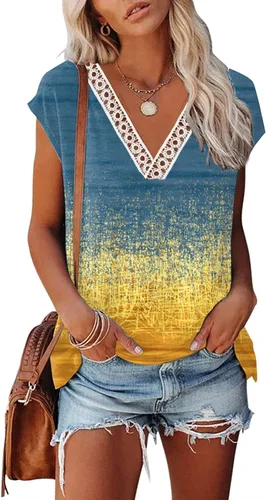 ETCYY Camisetas de verano para mujer 2023, a la moda, ajuste holgado, con encaje y estampado floral, manga casquillo, blusas