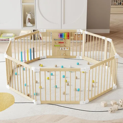 Forma y tamaño ajustables: este corralito para bebés cuenta con múltiples paneles desmontables, lo que permite personalizar la forma y el tamaño según los requisitos del centro de actividades del bebé y los diseños de la habitación. El corralito de madera está equipado con un bloqueo de forma fija entre cada dos paneles, lo que garantiza seguridad y estabilidad. Crea un área de juego segura para que los bebés se muevan libremente mientras se adaptan perfectamente al entorno de tu hogar. Por ejemplo, el parque infantil de madera se puede configurar como una zona de actividad hexagonal en la sala de estar, una forma de U compacta cerca de la cocina o una barrera protectora en el vivero. Parque infantil con juguetes incorporados: nuestra valla para bebés cuenta con 2 paneles multifuncionales integrados con juguetes educativos. Los padres pueden personalizar las combinaciones de juguetes en función de la etapa de desarrollo de sus hijos, fomentando la interacción de aprendizaje y estimulando el desarrollo cognitivo. También puede ser un centro de actividades ideal para bebés de 6 a 12 meses y emancipar a los padres del arduo trabajo. No hay necesidad de comprar juguetes separados: el entretenimiento está integrado. Diseño estable y bloqueo de seguridad: El espaciado científico y los estándares de altura evitan eficazmente que los brazos y las piernas del bebé se atasquen o salgan. La puerta de madera para bebés tiene un diseño de doble protección, y el bebé no puede abrirla solo. Nuestro corral para bebés está hecho de material sólido y estable. Cada palo es de 0.6 pulgadas de diámetro, que no se rompe fácilmente. Además, la parte inferior del corralito de madera plegable está equipada con almohadillas antideslizantes, fijadas en su lugar para evitar que el bebé empuje. Madera maciza natural: este corralito ajustable para puerta de bebé está hecho de madera maciza natural, que es resistente y duradera. La valla para bebés no requiere pintura, no tiene olores tóxicos, es totalmente natural e inofensiva, y más respetuosa con el medio ambiente. El corralito para bebés y niños pequeños tiene una superficie lisa y pulida sin bordes afilados ni juguetes tratados con productos químicos, por lo que no tienes que preocuparte de que tu bebé se lastime. Plegable y portátil sin montaje: puedes disfrutar de la comodidad de un corralito plegable que no requiere montaje, diseñado para padres ocupados con una configuración rápida. El corralito grande para bebé es plegable para un fácil transporte y almacenamiento, ahorra espacio, y puede ser plegado/desplegado por una persona. Con solo 24.3 libras, es fácil de mover entre la sala de estar, la cocina o la guardería sin levantar objetos pesados. También es muy adecuado para uso en exteriores.