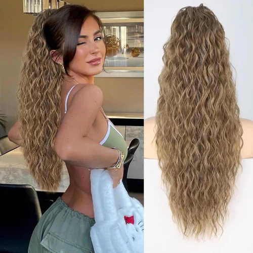 Extensión de cola de caballo de 26 pulgadas de largo, color negro, para mujer, extensiones de cabello sintético largo rizado ondulado con clip