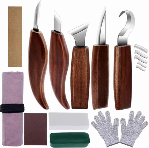 Juego de cuchillos de grabado 12 en 1: el juego de herramientas de tallado de madera contiene 12 artículos, que son 5 cuchillos de tallar madera, 5 protectores de hoja de cuchillo, 1 bolsa de almacenamiento, 2 papel de lija, 1 cera de afilar, 1 cuero para afilar, 1 par de guantes. El paquete bien equipado puede satisfacer sus diferentes necesidades, también se puede adaptar perfectamente tanto al trabajo duro como al tallado fino. Protege la seguridad: la herramienta de tallado de madera viene con guantes resistentes a los cortes que se pueden usar mientras se usan para evitar que te cortes las manos, lo que es perfecto para principiantes; con una bolsa de almacenamiento de lona enrollable en la que cada accesorio se puede colocar y enrollar ordenadamente para ocultar completamente las cuchillas afiladas y las puntas de los cuchillos. Existen múltiples salvaguardias para garantizar que no se dañe para proteger su seguridad. Hoja afilada: el cuchillo de tallar está hecho de acero de aleación de cromo vanadio que ha sido pulido muchas veces, de alta dureza, lo suficientemente afilado como para soportar la corrosión, más resistente al desgaste que otros productos para un uso prolongado. La hoja afilada te permite tallar el patrón de forma deseado a voluntad con poco esfuerzo. Mango ergonómico: el cuchillo para tallar niños está diseñado ergonómicamente con un mango de nogal que se adapta perfectamente a la mano, lo que permite que tanto adultos como niños sostengan la herramienta de madera de forma segura sin deslizarse, por lo que es posible trabajar durante largos períodos de tiempo sin fatiga de la mano, lo que es ideal para su uso por profesionales. Ten en cuenta que debido a que el mango está hecho de madera natural, el patrón y el color de cada mango pueden variar. Amplia aplicación: las herramientas de tallado se pueden utilizar para adultos, niños, principiantes, madera, cucharas, cuencos, tazas, calabazas, bricolaje, carpintería, tallado, moldeado, corte, madera y manualidades, también es un gran regalo para principiantes, aficionados y talladores de madera profesionales. 💯【Servicio sin preocupaciones】Cuando recibas nuestro juego de herramientas de tallado de madera, si tienes alguna insatisfacción, no dudes en ponerte en contacto con nosotros. Te ayudaremos a resolver el problema dentro de las 24 horas hasta que estés satisfecho. El paquete incluye: juego de herramientas para tallar madera 12 en 1.