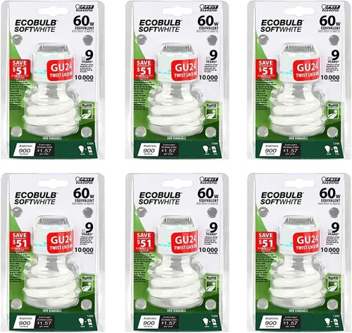 La luz blanca suave Feit Electric BPESL13T/GU24 60W Mini Twist GU24 Base CFL 2700K no es regulable y reemplazará a una bombilla incandescente equivalente a 60 vatios. Produce una salida de luz similar de 900 lúmenes, utiliza 13 vatios de electricidad y hasta un 78% menos de energía que una bombilla incandescente estándar. Esta luz fluorescente compacta es ideal para ventiladores de techo, candelabros, lámparas de mesa o apliques de pared. Las bombillas Feit Electric CFL tienen un rendimiento de funcionamiento relativamente fresco, una vida promedio de 10000 horas/9.1 años y cumplen con RoHS / FCC. Elija una bombilla de iluminación confiable y de uso general para aplicaciones residenciales o comerciales
