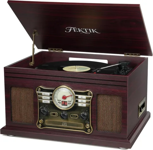 FEKTIK Tocadiscos Bluetooth 10 en 1, tocadiscos de 3 velocidades con altavoces, entrada y salida Bluetooth, CD, casete, radio FM, transmisión