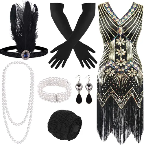 Pregunta sugerida sobre FEPITO Vestido de lentejuelas con cuello en V de los años 20 con flecos y accesorios de los años 20 ¿Este producto sí me sirve para lo que necesito?