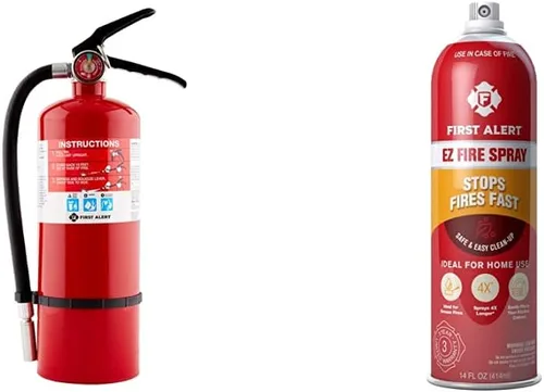 El extintor First Alert PRO5 tiene clasificación UL 3 A: 40 B:C y supera los requisitos mínimos de código 2 A:10 B:C; cuenta con una construcción duradera de metal con una válvula y cabezal de metal de grado comercial El extintor de incendios resistente es ideal para oficinas en casa y pequeñas empresas, y combate incendios de madera, tela, papel, líquidos inflamables e incendios eléctricos Utiliza un agente extintor de fosfato de amonio mono; Recargable por profesionales certificados después de su uso Incluye soporte de montaje y manómetro fácil de leer, codificado por colores, resistente a la corrosión El extintor portátil First Alert EZ Fire Spray descarga 4 veces más que un extintor tradicional, proporcionando 32 segundos de tiempo de extinción de incendios La lata de aerosol ligera es fácil de sostener, transportar y usar; ideal para cocina, garaje, barco, caravana, dormitorio y más Apaga fuegos de papel, tela, madera, grasa y electricidad La fórmula es biodegradable y no tóxica y se limpia con un paño