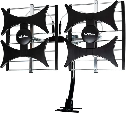 ❤️[Nueva antena multidireccional para exteriores] Disfruta de canales HD locales gratuitos y sin facturas de cable. La antena para exteriores recibe canales HD 4K, 1080P, 1080i, 720p como noticias locales, ABC, CBS, NBC, PBC, Fox, comedias de situación, niños, programas deportivos y mucho más. Corta el cable y con esta potente antena para exteriores, puedes ahorrar ahora y sin cable, sin problemas. ❤️[Recepción de señal mejorada] Los elementos multidireccionales ofrecen rango y recepción en lugares menos que ideales. La antena puede recoger canales VHF y UHF. Con esta tecnología de refuerzo permite alcanzar la señal hasta 200 millas (depende de su distancia desde la torre de señal más cercana, las obstrucciones entre su casa y la torre de señales). ❤️[Diseño novedoso e innovador] Nuevo diseño multidireccional con doble receptor para una recepción de señal más estable y fuerte. A diferencia de otras antenas de marca, la antena Five Star tiene innovación en la estructura y una potente recepción. ❤️[Rendimiento resistente a la intemperie] Esta antena multidireccional para exteriores tiene un rendimiento actualizado al aire libre. La antena tiene material bien construido con un diseño duradero y recibe señales digitales y de alta definición. ❤️[Ahorra ahora y disfruta de canales gratuitos] El paquete incluye: antena de TV multidireccional Five Star y cable coaxial RG6 de 40 pies, poste de montaje y kit de instalación opcional. Monta libremente nuestra antena Five Star con el poste en el techo, ático, chimenea, alero, mástil o fuera de la casa con o sin línea de visión. La antena ha preensamblado para algunas piezas. Requiere montaje completo. ---Satisfacción del cliente al 100% – Ponte en contacto con el vendedor o el soporte de Amazon para preguntas y resolución de problemas. El mejor regalo para padres y familiares para Acción de Gracias, Navidad y Año Nuevo.