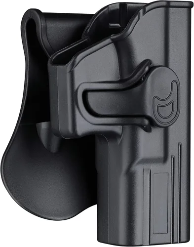 Compatible e incompatible: compatible con Glock 17 19 19x 22 23 31 32 generación 1 2 3 4 5, airsoft glock 17 19; incompatible con polymer80 glock 19 23 32. La parte inferior del soporte está abierta para soportar el barril más largo que sobresale. Alta seguridad: retención de nivel II. Se bloqueará automáticamente en el gatillo cuando coloques el arma y emitirá un sonido de "clic" para indicar que está asegurada de forma segura. Saca el arma rápidamente presionando el botón con el dedo índice. Excelente diseño: Fabricado con material de polímero militar, fácil de limpiar y mantener, tan ligero para transportar. Estructura simple en el diseño interno. El botón sobresaliente hace que sea más fácil de tocar y su raya antideslizante te ayuda a reconocerlo a través de tu sentido del tacto. Accesorio de paleta: engranaje de dientes de 360 grados para rotación omnidireccional, siéntase libre de usar en correas web dentro de 2 pulgadas y cinturones de trabajo. Las partes traseras lisas son más fáciles de deslizar en tu cinturón, los tornillos traseros hacen que sea más fácil quitar e instalar accesorios. Ampliamente utilizado: Adecuado para diferentes lugares como militares, instructores, entrenadores de tiro, agencias de cumplimiento de la ley o uso de protección personal. Ideal para civiles y oficiales fuera de servicio.