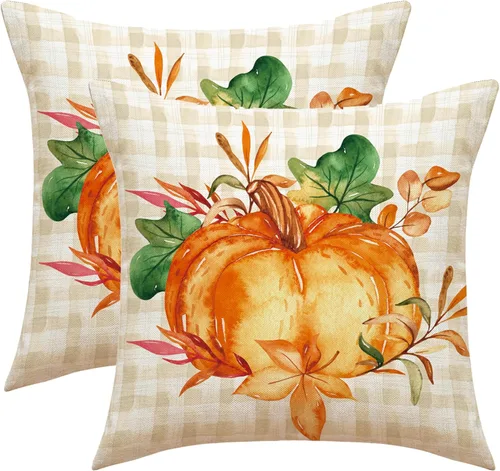 Fundas de almohada de otoño de 18 x 18 pulgadas, diseño de acuarela naranja, calabaza, búfalo, hojas a cuadros, funda de almohada decorativa