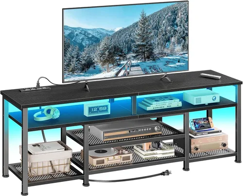Furologee Soporte de TV con tomas de corriente y luces LED, centro de entretenimiento de 55 pulgadas para televisores de 55 y 60 pulgadas, mesa Negro