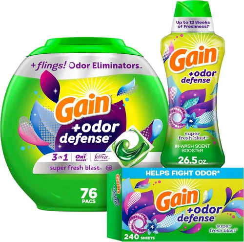 Gain Flings - Paquete de detergente para ropa con defensa del olor, Super Fresh Blast, 76 unidades + Gain + cuentas potenciadoras de aroma para