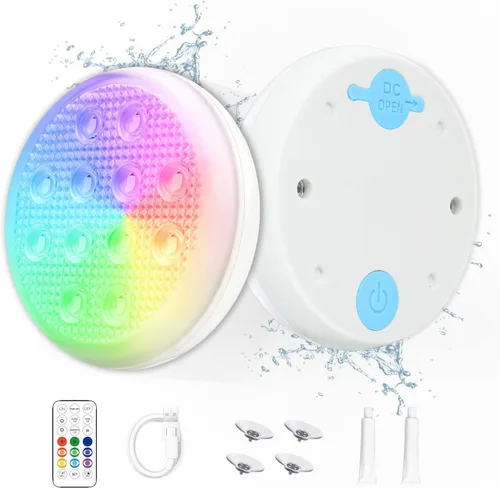 Elevando el disfrute de la vida: diseñada para crear un entorno romántico, esta luz LED submarina incorpora 12 bombillas LED. Ofreciendo 16 colores estáticos y 3 modos dinámicos (flash, desvanecimiento, suave), así como una función de temporización, ofrece una variedad de opciones y ayuda a crear un ambiente más atractivo. Fuente de alimentación recargable: una opción ecológica, la luz viene con una batería recargable incorporada de 2200 mAh, que se puede encender con el cable USB incluido. No es necesario invertir en baterías desechables, reduciendo tanto sus gastos como el impacto ambiental. Métodos de montaje versátiles: esta luz submarina cuenta con un diseño que incluye una placa base, imanes y ventosas para una instalación variada. Use ventosas para piscinas, imanes para superficies de acero y adhiera la placa base a las paredes. Nota: Evite usar imanes en superficies lisas como puertas de refrigerador, ya que puede deslizarse; las ventosas funcionan mejor en estas superficies. Clasificación de impermeabilidad IP68: sellado superior: la combinación única de un anillo impermeable de silicona y una cubierta de material impermeable proporciona a esta luz LED submarina una mayor resistencia al agua en comparación con otros productos. Cada lámpara ha sido sometida a una prueba de impermeabilidad IP68, lo que garantiza que se pueda sumergir de forma segura en agua sin corrosión ni marcas de agua. Amplio potencial de aplicación: apto para una multitud de ajustes: estas luces brillantes para piscina funcionan eficazmente tanto en condiciones húmedas como secas. Son perfectos no solo para uso bajo el agua en piscinas y acuarios, sino que también son excelentes para bañeras. Además, pueden servir como luces decorativas para el uso diario. Con un solo control remoto, puedes operar simultáneamente todas las luces (rango de control máximo de 196 pies en aire/16.4 pies en el agua, alcance remoto óptimo de 6.56 pies).