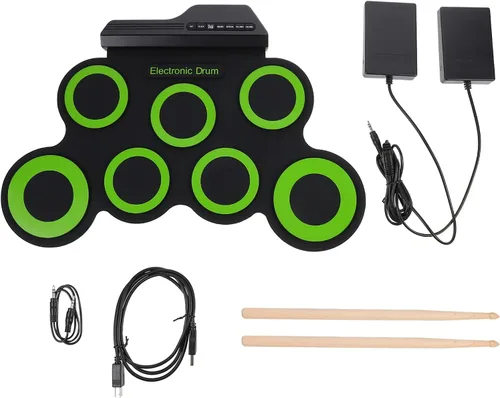 Descripción Este artículo es un juego de tambor de rollo manual, que está bien hecho de material de primera calidad, muy duradero. Efectos de calidad de sonido puro, para que los profesionales tengan los juicios audiovisuales correctos y mejoren el interés por el aprendizaje. Se puede crear usted mismo, la cabeza del tambor se siente real, lo que le permite tener una experiencia real de batería. Características- Color: Verde.- Material: Silicona, ABS, componentes electrónicos.- Tamaño: Aproximadamente 51. 50 x 37 pulgadas. 50 x 9. 0.0 in/ 20. 24 x 14. 74x3. 54inch.- Efectos de calidad de sonido puros, para que los profesionales tengan los juicios audiovisuales correctos y mejoren el interés de aprendizaje.- Se puede crear usted mismo, la cabeza del tambor se siente real, permitiéndole tener una experiencia real de batería.- Puede conectar un estéreo para aprovecharlo mejor. - Tamaño compacto y batería electrónica portátil enrollable, muy conveniente para llevar y almacenar.- Para el aprendizaje de batería practicando de niños o principiantes, familia entretenimiento y reunión de amigos. Especificación Tonos del conjunto de baterías: Rock, Latin, Electro, Canciones de demostración de percusión: Heavy Rock, Funk, Latin, Samba, Cha- Cha, Swing- Hat, Upbeat Rock Power: Cable USB (incluido) o 2 pilas AAA (no incluidas) Potencia: DC 5V Entrada: 2. Salida de 5 W: paquete de 2 W que incluye 1 x tambor electrónico 2 x baquetas 2 x pisadas de pie 1 x cable USB