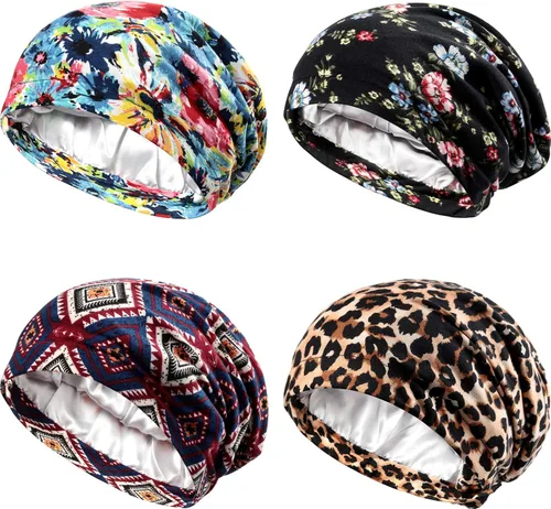 Geyoga 4 piezas de gorro de satén de seda para mujeres durmiendo, gorro de dormir de doble capa, gorro de dormir holgado