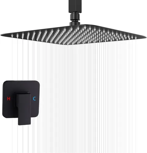 GGStudy - Sistema de ducha de techo negro, grifo de ducha de lujo, mezclador de lluvia, sistema de cabezal de ducha de 10 pulgadas, negro mate con