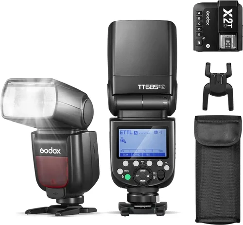 TT685IIC y X2T-C: totalmente compatible con TTL, Autoflash, HSS, X2T-C logra una transmisión de señal en tiempo real estable, confiable y efectiva, lo que la convierte en una buena opción para fotógrafos que tienen varias demandas de iluminación. Adecuado para cámaras DSLR Canon EOS 400D Digital 450D 500D 550D 600D 650D 1000D 1100D 30D 40D 50D 60D 5D Mark II 5D Mark III 6D 7D. 【Sistema inalámbrico Godox 2.4G X】El TT685Il también está integrado con el sistema inalámbrico Godox 2.4G que proporciona una conectividad perfecta con flashes o flashtrigger compatibles. La amplia selección de grupos y canales garantiza un proceso de disparo fácil sin ninguna interferencia. El sistema inalámbrico también te da la máxima libertad para la configuración de iluminación con una variedad de conexiones de hasta 328.1 ft. Conversión instantánea TCM: el TT685ll se añade con la función TCM para mejorar tu eficiencia de disparo. TCM permite la conversión instantánea del modo TTL al manual. Al mismo tiempo, esta función te ayuda a bloquear el valor de exposición adecuado asegurando cada fuego con una expresión precisa de luz. Bloqueo de liberación rápida: al igual que las otras adiciones mejoradas a la línea GodoxTTL Flash, el TT685ll está diseñado con bloqueo de liberación acuick para garantizar una configuración suave, lo que te ayuda a capturar la próxima obra maestra en los momentos críticos. Varios modos de flash para creatividad ilimitada: el TT685ll continúa las funciones en modo TTL, manual y multiflash. En modo TTL, todas las funciones como HS (hasta 1/8000s), FEC, FEB, sincronización de cortina trasera, etc. te ayudan a capturar cada momento espléndido de forma rápida, precisa y creativa. En modo manual, hay 22 pasos de salida de potencia de 1/1 a 1/128 para su ajuste libre. 【Puerto de alimentación aporta una velocidad y potencia increíbles】Con el puerto de alimentación, puedes conectar el TT685ll con una fuente de alimentación externa de litio como PB960 para aumentar el rendimiento del flash para más posibilidades. El TT685 será tu próximo caballo de batalla para disparar bodas reales, moda callejera, fotografía de noticias y mucho más.