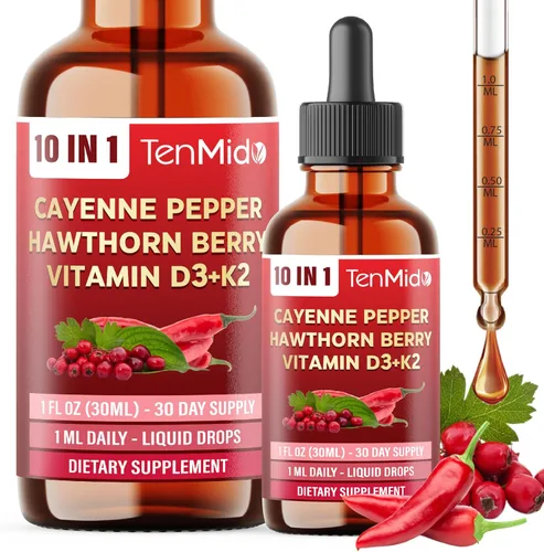 Ingredientes clave: Las gotas líquidas de pimienta de cayena contienen vitamina D3, vitamina K2, bayas de espino, berberina HCl, raíz de remolacha, canela de Ceilán, Panax Ginseng, curcumina de cúrcuma y raíz de jengibre para apoyar el bienestar corporal total. Beneficios potentes: Suplemento líquido de pimienta de cayena 10 en 1 para apoyar el sistema inmunológico, la salud cardíaca, la salud digestiva y la flexibilidad y movilidad. Uso conveniente: Tome 0.0 fl oz de gotas líquidas de pimienta de cayena por día. Cada botella de 1.0 fl oz proporciona un suministro mensual completo para adaptarse perfectamente a tu rutina diaria. Compromiso con la calidad: Tenmido se dedica a obtener los mejores ingredientes para crear suplementos de confianza. Cada lote no es OGM y probado por terceros para su calidad, pureza y potencia, lo que les ayuda a cumplir con los más altos estándares. Satisfacción garantizada: Apoya su viaje de salud y bienestar. Cuando eliges nuestras gotas líquidas de pimienta de Cayena, estás eligiendo un producto respaldado por rigurosos estándares de calidad y un compromiso con la excelencia.
