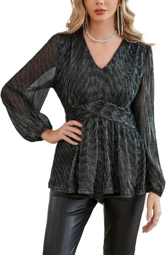 GRACE KARIN Blusa plisada de lentejuelas con cuello en V y mangas de farol brillantes para mujer