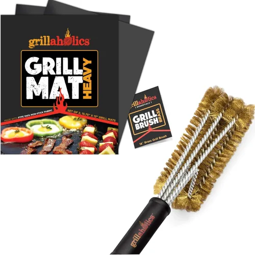 Cepillo de latón Essentials: quieres una parrilla limpia sin tener que preocuparte por la seguridad de tu familia. Lo entendemos. Las cerdas son excelentes para limpiar su parrilla, pero son una adición horrible a su deliciosa comida a la parrilla. Es por eso que el cepillo de limpieza para parrilla Grillaholics está fabricado con latón inoxidable resistente y triple probado a máquina con los más altos estándares de seguridad. Nuestros cepillos son un 50% más fuertes y duran un 25% más que otros cepillos de parrilla inferiores. Cepillo para parrilla de latón esencial: no diremos que te estás perjudicando... pero no todos los cepillos son seguros para cualquier rejilla de parrilla. Recomendado para todos los tipos de parrilla, las cerdas de latón son más suaves y no rayan las rejillas de porcelana y cerámica. ¿Tienes un Char-Broil, Weber, Big Green Egg, Blackstone, parrillas de gas, carbón, ahumadores, infrarrojos?... Nuestro cepillo de limpieza de parrilla premium no discrimina. ¡Raspará los alimentos quemados de cualquier tipo o marca de parrilla con facilidad! [Alfombrilla para parrilla pesada] Con más opciones de alfombrillas de parrilla que cualquier otra empresa de accesorios de parrilla en el mercado, ¿por qué te conformas con algo menos? Rediseñado y construido resistente a 0.015 in, el tapete Grillaholics Grill Mat Heavy es 2-4 veces más grueso que la mayoría de los otros tapetes de parrilla y puede soportar temperaturas de hasta 600 grados... lo que significa mejores marcas de parrilla. [Alfombrilla para parrilla pesada] Saca el máximo provecho de tus activos de barbacoa con nuestras alfombrillas para parrilla. Versátil y reutilizable Grillaholics Grill Mat Heavy se puede utilizar más de 1000 veces por lado. Eso es 10-20 veces más que alfombrillas de parrilla más baratas y endebles. Funciona con cualquier tipo de parrilla y funciona como una alfombrilla para hornear. [Experimenta la promesa de Grilaholics] Todos nuestros productos están respaldados por Grillaholics Promise, lo que significa que puedes comprar con confianza sabiendo que obtendrás un producto que te gusta o haremos lo que sea necesario para hacerlo bien. ¡Prueba el tuyo sin riesgos! Considera comprar dos, uno para ti y otro para tu mejor amigo