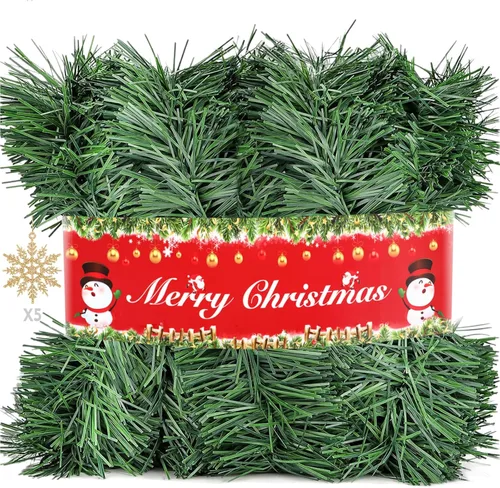 Opciones de múltiples longitudes: La guirnalda para el árbol de Navidad está disponible en 3 longitudes universales para adaptarse a cualquier necesidad de decoración: 5 metros (17 pies), 10 metros (33 pies) y 15 metros/50 pies (incluyendo 5 piezas de copos de nieve). Mide la longitud que necesitas antes de comprar. Se recomienda elegir una longitud más larga de lo esperado debido a que nuestra guirnalda de Navidad se puede cortar libremente. **Material Impermeable Premium**: La guirnalda de Navidad para exteriores está hecha de material de PVC artificial de alta calidad, decoración de guirnalda verde impermeable diseñada para resistir los elementos, resistente a la lluvia, nieve y viento, lo que la hace ideal para tu decoración navideña. Disfruta de la decoración navideña de LOISVI: La guirnalda es fácil de cortar a la longitud deseada, lo que hace que sea simple y conveniente personalizar tus decoraciones navideñas. Su diseño flexible te permite dar forma al árbol de Navidad, coronas de Navidad y decoraciones de regalo. Combínalo con adornos adicionales como guirnaldas de luces, cintas, campanas, pino o bayas (no incluidas). Diseño esponjoso y pensado: Nuestras guirnaldas artificiales de Navidad se empaquetan con cinturones exquisitos, lo que mantiene las guirnaldas esponjosas en comparación con el empaquetado comprimido que las aplastaría. Hecho a mano con 5 capas de material grueso para hacer que las guirnaldas de color verde oscuro estén más llenas y se sientan más como guirnaldas de Navidad reales. 𝐏𝐞𝐫𝐟𝐞𝐜𝐭𝐚 𝐝𝐞𝐜𝐨𝐫𝐚𝐜𝐢ó𝐧 𝐲 𝐮𝐬𝐨 𝐚𝐦𝐩𝐥𝐢𝐨: La guirnalda lisa de Navidad es perfecta para tu hogar, sala de estar, dormitorio, puerta principal, repisa de la chimenea, barandilla de la escalera, marcos de ventana, entrada, decoraciones de Navidad para interior o exterior.