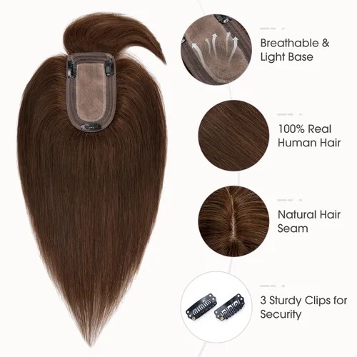 Hairro Toppers de cabello humano con flequillo, clips en extensiones de cabello 100% real para mujeres, base de seda de 2.8 x 5.1 pulgadas