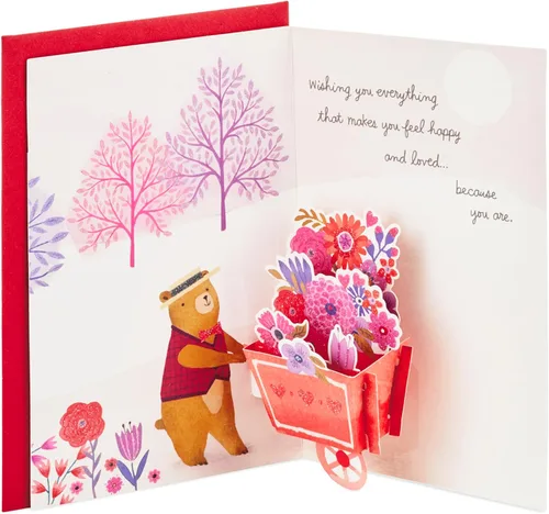Mensaje principal: Pensando en ti en el Día de San Valentín Mensaje interior: Deseándote todo lo que te hace sentir feliz y amado... porque lo eres. La tarjeta de felicitación desplegable del día de San Valentín cuenta con una colorida escena de un oso sosteniendo flores en un bosque. En el interior, una imagen llamativa y dimensional del oso empujando un carrito emergente lleno de flores troqueladas en capas se combina con un mensaje amoroso. Acentos con purpurina. Hallmark La tarjeta del día de San Valentín mide aproximadamente 5 pulgadas de ancho x 7.25 pulgadas de alto y viene con un sobre a juego. El color del sobre puede variar. Impresas en papel de alta calidad, las tarjetas de felicitación Hallmark están hechas con papel de bosques gestionados de manera responsable.