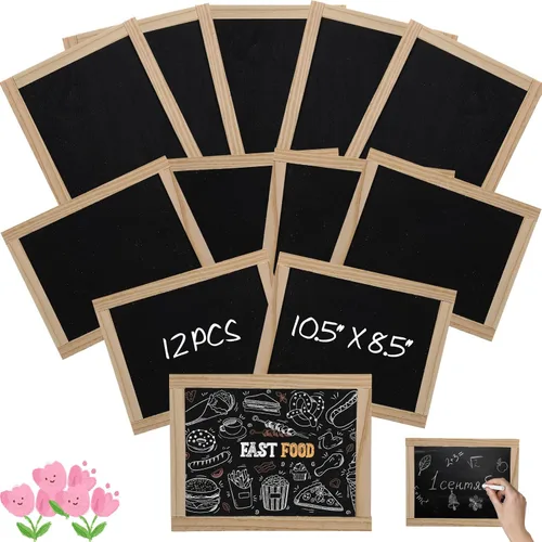 Amplio para usar y compartir: recibirás 12 carteles pequeños de pizarra con marco de madera, el tamaño es de aproximadamente 10.5 x 8.5 x 0.4 pulgadas, suficiente para satisfacer tus necesidades de escritura y pintura Material de calidad y fiable: el tablero de tiza está hecho de madera maciza, útil y confiable, confiable para servirte durante mucho tiempo; el marco en blanco combina con la pizarra negra, se ve agradable y liso, ideal para la mayoría de las personas Se puede borrar muchas veces: el tablero de tiza es de doble cara, tienes 2 lados para escribir, puedes utilizar tiza líquida y tiza regular para escribir, y los rastros se pueden borrar para el próximo uso; Nota: es mejor limpiarlo con una toalla de papel húmedo o un trapo Múltiples funciones: la pizarra de doble cara es práctica en tu vida diaria, se puede utilizar como anuncio, anuncio, mensaje, nota, calendario y lista de tareas, para recordarte la tarea que tienes por delante Ampliamente aplicable para diferentes escenas: las mini pizarras de tiza se pueden aplicar ampliamente para bodas, fiestas de cumpleaños, baby shower, aniversarios, aulas, suministros escolares, cafeterías, bares, restaurantes, cocinas, tiendas, parques infantiles y más, para escribir claramente y hacer que tus invitados vean claramente