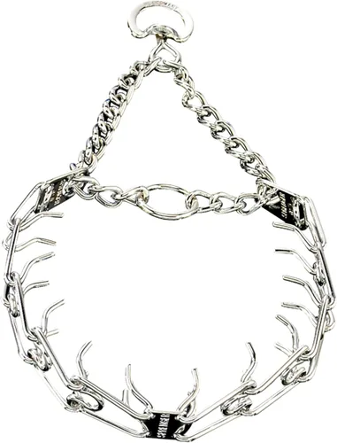 Herm Sprenger | Collar de entrenamiento de puntas | Acero cromado | Enlaces de punta de 0.157 in | Anillo en D giratorio El collar está diseñado para perros con cuello de hasta 22 pulgadas. La longitud total del cuello es de 25 pulgadas Conjunto de placa central desde el cual se unen cinco (5) eslabones de púas a ambos lados de la placa central con eslabones de púas colocados direccionalmente hacia la cadena de martingala, colocando una presión uniforme en los lados del cuello y no en la tráquea. Los extremos de las puntas están biselados y pulidos. Este modelo se coloca alrededor del cuello pellizcando o apretando una punta para abrir el cuello Los eslabones de las puntas se pueden añadir y quitar para ajustar el ajuste. Los enlaces adicionales se pueden comprar por separado El fabricante recomienda este collar para un peso máximo de perro de 154.3 lbs o 154 libras