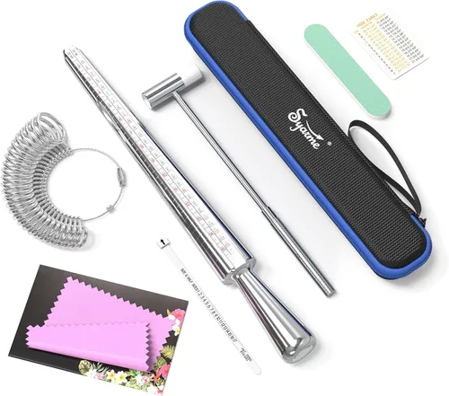La felicidad es tan simple: herramienta de medición del medidor de anillos te permite obtener tamaños precisos de dedos cuando no se da cuenta, dándole una sorpresa inolvidable, dile adiós a las adivinanzas y encuentra fácilmente el tamaño perfecto del anillo Diseñado para estadounidenses: tallas de EE. UU. 0-13 27 piezas, tamaño medible más ancho, también se proporciona regla suave de calibre de anillo y tarjeta de referencia de tamaño, lo que es muy conveniente, los incrementos de tamaño del anillo están claramente marcados en cada anillo para tamaños completos y medios Protección duradera de la caja de almacenamiento: la caja de almacenamiento personalizada de alta gama incluida mantiene la herramienta de medición de anillos en las mejores condiciones en todo momento, lo que es conveniente para llevar, usar y almacenar. Kit completo de medición de anillos para hombre y mujer Alta calidad y ampliamente utilizado: el mandril del calibrador de anillos está hecho de aluminio, que es ligero en peso. El grupo de calibre de anillo y el martillo de reparación están hechos de acero inoxidable, duradero y también hay un martillo de metal, para todo tipo de medición de anillos de dedo, personalización y corrección de anillo Servicio satisfactorio: la calidad del kit de herramientas de medición de anillos Syarme superará tus expectativas. Te permite medir fácilmente el tamaño de tus dedos y elegir el anillo adecuado para tu madre, esposa, novia o novio