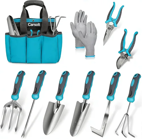 10 herramientas de jardinería completas: este juego completo de herramientas de jardín contiene todos los elementos esenciales. Puedes hacer una variedad de trabajos de jardinería como cavar, plantar, aflojar, podar y más, ¡perfecto para cualquier escena de jardinería en tu jardín, césped y patio! ¡Ten un juego de herramientas de jardín que sea suficiente para todas tus necesidades de jardinería! Acero inoxidable resistente a la oxidación: todas las herramientas están hechas de acero inoxidable resistente, que es más duro en general, duradero y menos propenso a la oxidación. La hoja está tratada con tecnología de pulido fino, y la superficie es brillante sin perder su filo. Su alta calidad mantiene su dureza durante mucho tiempo y tiene una larga vida útil. Mango ergonómico cómodo: la sección del mango de la herramienta manual de jardinería está ergonómicamente contorneada con un agarre para los dedos y un reposamuñecas, muy fácil de agarrar, reduciendo la fatiga de la mano y la muñeca para una mayor fuerza de excavación. Con agujeros para colgar para un fácil almacenamiento. ¡Las buenas herramientas pueden ayudar a que su jardinería sea más fácil y eficiente! Bolsas de lona para jardín con suficiente capacidad para todo: las bolsas de lona para jardín de gran capacidad se utilizan para guardar todas las herramientas de jardín y ayudarte a almacenar las herramientas de manera ordenada. Hecho de poliéster resistente, que es duradero y resistente a desgarros. ¡Tiene 8 bolsillos laterales externos con amplios elásticos encima de los bolsillos para mantener las herramientas en su lugar! Mantener tus herramientas perfectamente organizadas hará que la jardinería sea aún más agradable Un gran regalo de jardín: este completo juego de herramientas de jardinería será un regalo ideal para cualquier amante de la jardinería. Viene con caja de regalo, sorprende a tus amigos, familiares y amantes de la jardinería en cumpleaños, aniversarios, Pascua, Navidad o Día del Padre o de la Madre. Garantía y soporte de un año: Carsolt proporciona una garantía de un año en este juego de herramientas de jardín. Si surge alguna preocupación relacionada con el rendimiento, ofreceremos soluciones rápidas y profesionales para garantizar que disfrutes de una experiencia de jardinería con mayor tranquilidad.